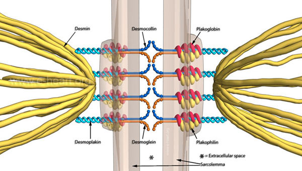 The desmosome. The cardiac myocytes have specialized intercellular junctions called the intercalated discs. Within the intercalated disc, there is a specific type of cell junction which is the desmosome. For simplicity, we illustrate only those proteins within the desmosome that have been found to have mutations in human diseases. Desmoglein and desmocollin are members of the cadherin superfamily of transmembrane proteins involved in cell adhesion. Desmoplakin interacts with cytoplasmic desmin filaments and the plaque proteins, plakoglobin and plakophilin. Through the interaction of plaque proteins with the cadherins, intermediate filaments are anchored to sites of cell-cell adhesion.