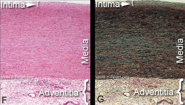 The image on the right is a Movat pentachrome stain which clearly demonstrate the elastic laminae (black lines) that alternate with the layers of smooth muscle cells. In the media, the smooth muscle cells stain red, and proteoglycan (mucopolysaccharides) stain green. The adventitial shows yellow connective tissue (collagen).