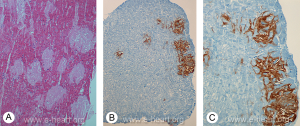 Nodular pattern of myocardial amyloid infiltration. A. Low magnification view the “amorphous” eosinophilic material forming distinct nodules within the myocardium. In contrast to the perimyocytic pattern, the amyloid deposits here, have completely obliterated and replaced the myocytes. The collapse of the myocytes allows the amyloid deposits to coalesce and form “nodules”. (H&E X50). B This endomyocardial biopsy shows distinct TTR-type amyloid nodules. (Immunohistochemistry for transthyretin. X25) . C. The is image clearly shows how the encroachment of amyloid and atrophy of myocytes produces the nodular appearance. (Immunohistochemistry for transthyretin. X 100)