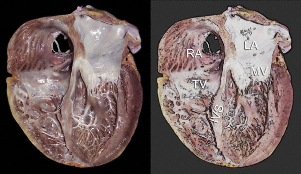 Comparison of a normal heart to a dilated cardiomyopathy heart readily shows a gobular shape with dilatation of the chambers.