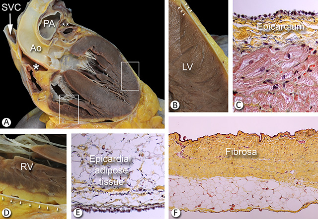 E. Light microscopy of the mesothelial lining over the adipose tissue of the right ventricle (visceral pericardium). Short elastic fibers (black) are present in the subepicardium.